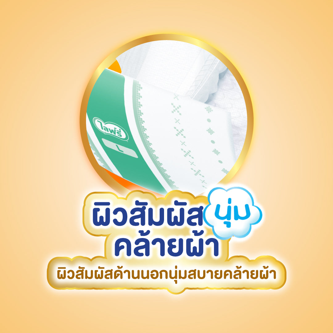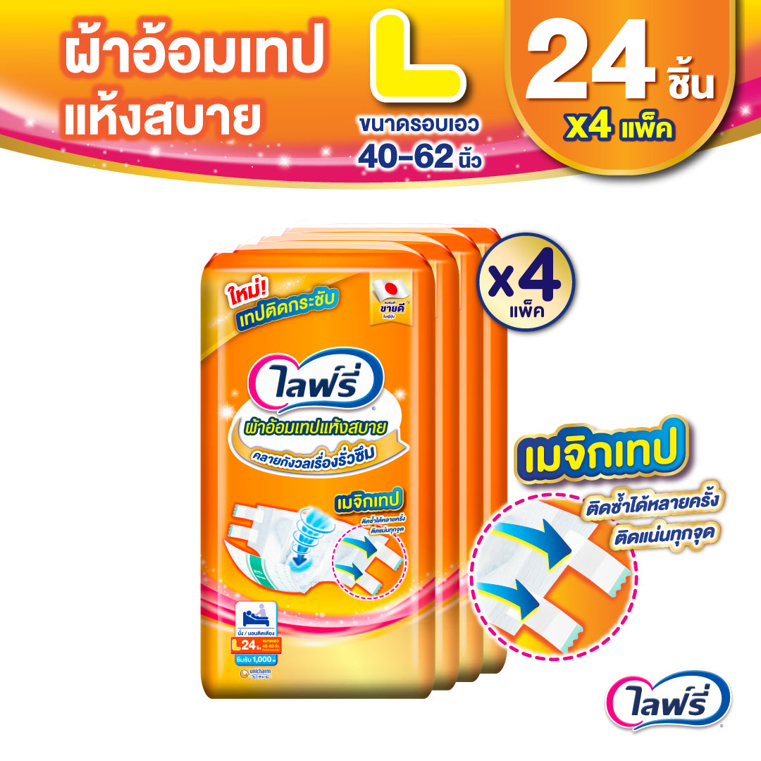 ไลฟ์รี่ ผ้าอ้อมเทปแห้งสบาย เหมาะสำหรับผู้สูงอายุที่ใช้เวลาส่วนใหญ่อยู่บนเตียง ด้วยเมจิกเทป ที่ติดซ้ำได้หลายครั้ง ติดแน่นทุกจุด ช่วยลดช่องว่างระหว่างขอบขาและรอบเอว คลายกังวลเรื่องรั่วซึม ผิวสัมผัสด้านนอกนุ่มสบายคล้ายผ้า