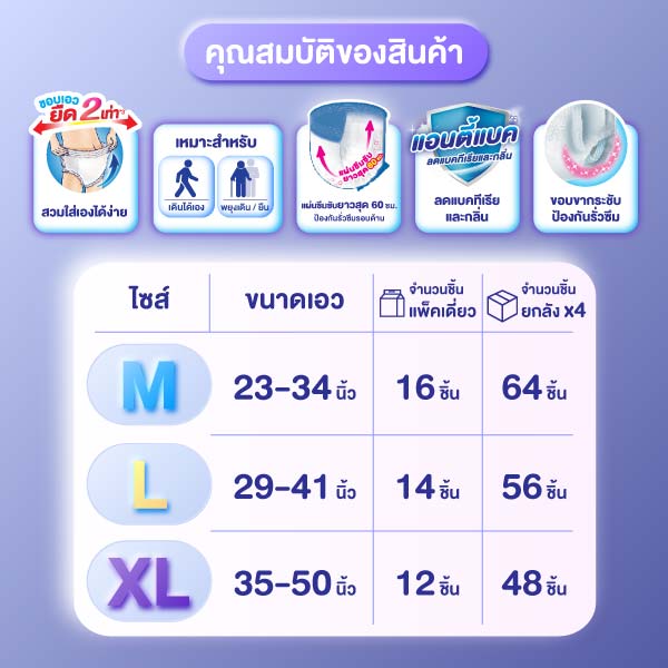 ไลฟ์รี่ กางเกงซึมซับตลอดคืน ป้องกันรั่วซึมรอบด้าน 360 องศา*5 ด้วยแผ่นซึมซับยาวสุด 60 ซม. ที่กระชับครอบคลุมตั้งแต่หน้าท้องถึงสะโพกด้านหลัง ซึมซับเร็ว และมากถึง 12 แก้ว* คลายกังวลเรื่องรั่วซึม แม้ใช้ในชั่วโมงที่ยาวนาน หรือตลอดทั้งคืน *1 แก้ว = 100 มิลลิลิตร*5แผ่นซึมซับยาวและขอบขากระชับช่วยลดช่องว่างและผ้องกันรั่วซึมได้รอบด้าน