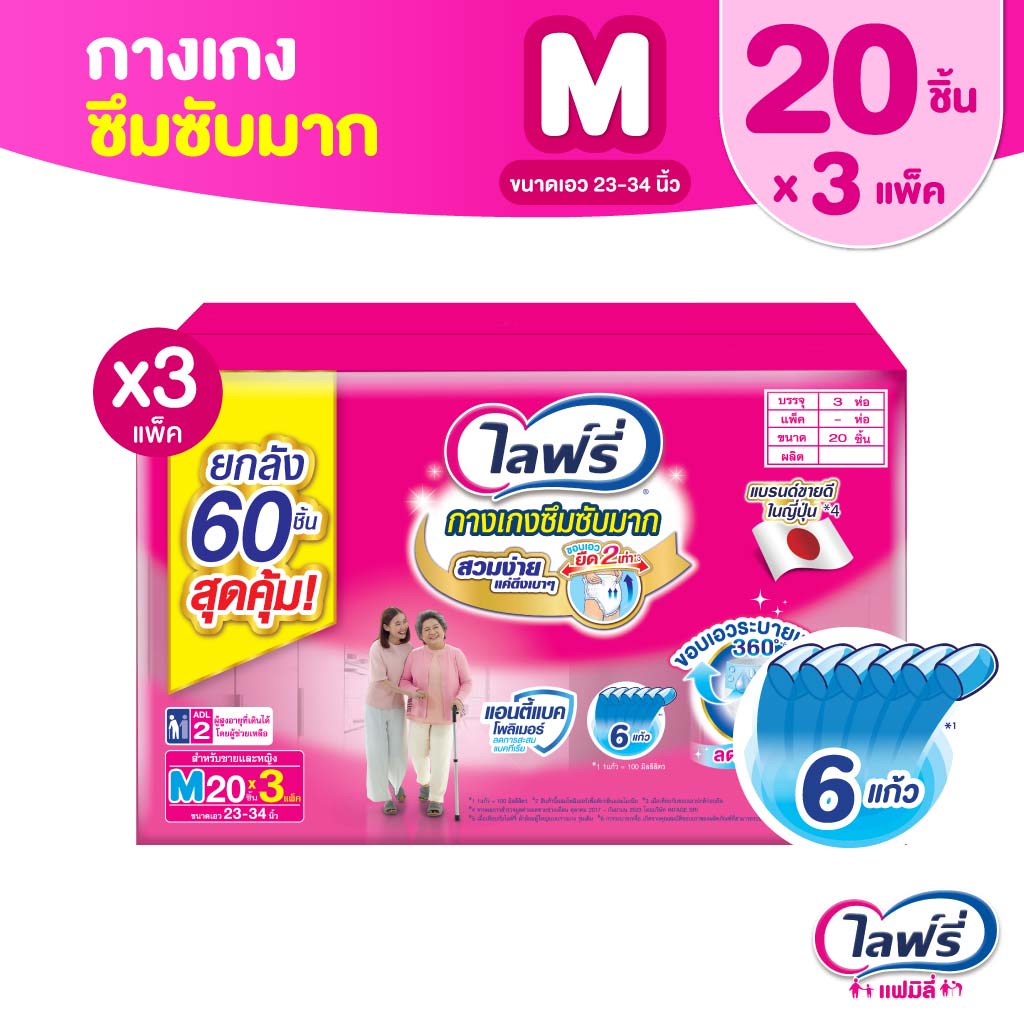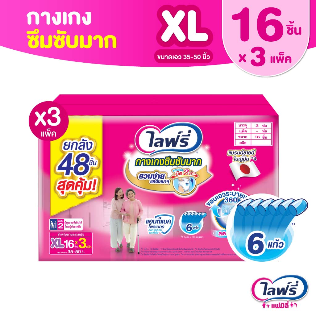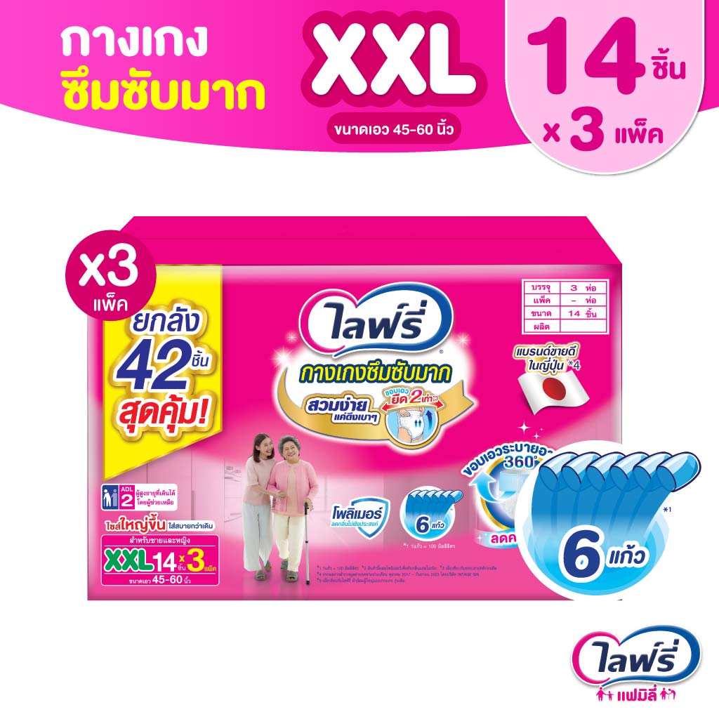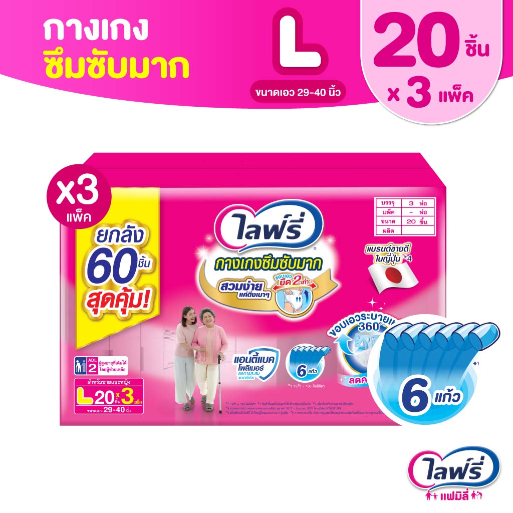 [เลือกไซส์เลย!] ขายยกลัง! ไลฟ์รี่ กางเกงซึมซับมาก ไซส์ M 20 ชิ้น/ L 20 ชิ้น/ XL 16 ชิ้น/ XXL14 ชิ้น จำนวน (1x3 ห่อ)