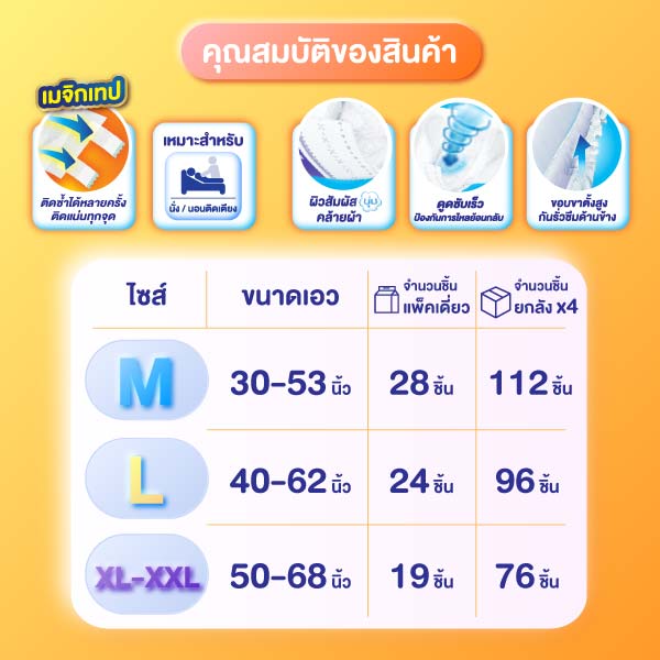 ไลฟ์รี่ ผ้าอ้อมเทปแห้งสบาย เหมาะสำหรับผู้สูงอายุที่ใช้เวลาส่วนใหญ่อยู่บนเตียง ด้วยเมจิกเทป ที่ติดซ้ำได้หลายครั้ง ติดแน่นทุกจุด ช่วยลดช่องว่างระหว่างขอบขาและรอบเอว คลายกังวลเรื่องรั่วซึม ผิวสัมผัสด้านนอกนุ่มสบายคล้ายผ้า